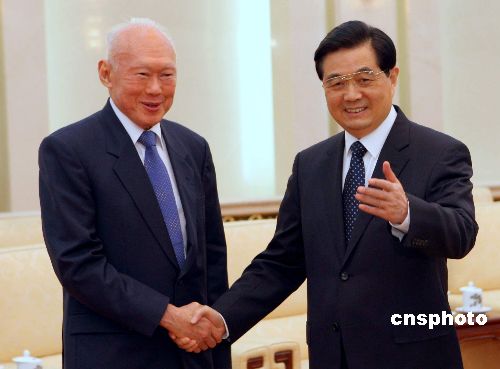 资料图:二00七年十一月十六日,中国国家主席胡锦涛在北京人民大会堂会见来访的新加坡内阁资政李光耀。 中新社发 任海霞 摄