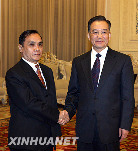 3月24日,国务院总理温家宝在北京人民大会堂会见老挝国会主席通辛·坦马冯。 新华社记者姚大伟摄