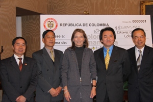 2011年2月1日,旅居哥伦比亚华侨华人社团向哥遭受洪涝灾害地区捐款仪式在哥总统府举行。哥总统夫人罗德里格斯主持仪式,驻哥大使高正月、哥侨联会主席徐铭添等出席。徐代表全体旅哥中国侨民向哥受灾地区捐赠了八千万比索。