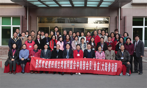 修福金与台湾新同盟会中南部会员(会友)大陆参访团团员在民革中央机关楼前合影。(中国台湾网 王赛赛 摄)