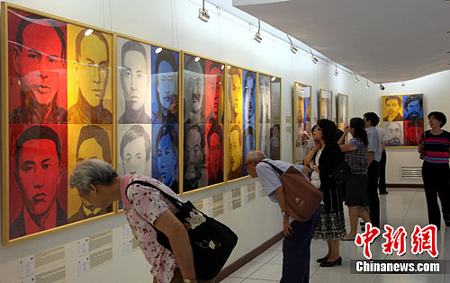 9月29日,孙中山嫡孙女孙穗华和辛亥革命元勋黄兴嫡孙黄绍强的画展在台北“国父纪念馆”开展。图为台湾民众正在观看黄绍强的辛亥革命英烈肖像画。中新社发 陈立宇 摄