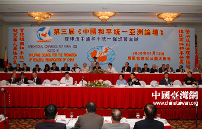 中国台湾网1月19日马尼拉消息 由菲律宾中国和平统一促进会主办的第三届“中国和平统一亚洲论坛”于今天上午在马尼拉世纪花园酒店开幕。