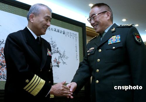 2月27日下午,中华人民共和国中央军委副主席、国务委员兼国防部长曹刚川上将,在北京八一大楼会见来访的日本自卫队联合参谋长斋藤隆海军上将。曹刚川说,台湾问题事关中国的核心利益,希望日本方面从维护地区和平稳定和中日关系大局出发,尊重中方在台湾问题上的立场和主张,旗帜鲜明地反对“台独”。 中新社发 宋吉河 摄