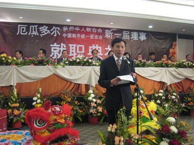 2009年5月13日晚,厄瓜多尔华侨华人联合会、中国和平统一促进会在基多举行新一届理事就职典礼,中国驻厄瓜多尔大使蔡润国及专程到访的广东省外办代表团应邀出席。