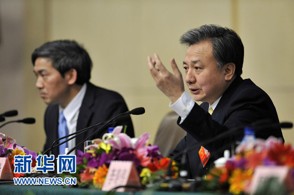 3月8日,十一届全国人大五次会议在北京梅地亚中心举行记者会,全国人大常委会法制工作委员会副主任郎胜、全国人大常委会法制工作委员会刑法室副主任李寿伟就《中华人民共和国刑事诉讼法修正案(草案)》相关问题答记者问。这是全国人大常委会法制工作委员会副主任郎胜回答记者提问。新华社记者 王鹏 摄