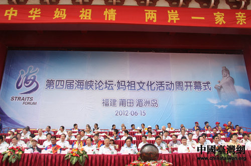 中国台湾网6月15日莆田消息 以“中华马祖情、两岸一家亲”为主题的第四届海峡论坛·妈祖文化活动周于今日上午在湄洲岛天后广场举行开幕式。本届妈祖文化活动周以全国台联为指导单位,由莆田市人民政府、福建省台办、福建省台联共同主办。莆田市政协主席林庆生主持了开幕式,莆田市长梁建勇致欢迎词,中华妈祖文化交流协会副会长兼秘书长、湄洲妈祖祖庙董事长林金榜及台湾妈祖宫庙代表蔡咏锝致辞。在开幕式上,全国台联主席梁国扬等四位嘉宾共同启动“第四届海峡论坛·妈祖文化活动周”开幕按钮。