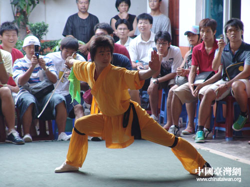 中国台湾网8月10日福建莆田消息 首届两岸青年联欢节“海峡西岸青年欢乐行”莆田参观考察组因受到“宝霞”、“ 桑美”两台风的影响,在上午取消了赴湄洲岛参访祭拜妈祖祖庙活动。在莆田市接待工作组及台湾十杰青年基金会的协调安排下,参观南少林,观看少林武术的表演成为昨天下午的新内容。