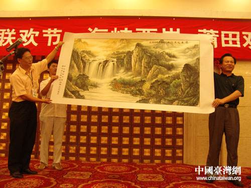 从南少林寺回到宾馆,莆田接待工作组为台湾来的客人们准备了丰盛的晚宴和节目表演,现场气氛热闹温馨,台湾十杰基金会和莆田市的代表还互赠礼物留作纪念。(钟宝华)