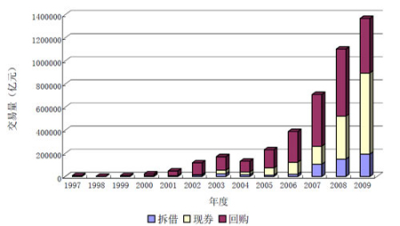 一是成交量继续大幅增加。2009年,银行间市场成交量突破130万亿元,同比增长24.2%。其中,现券成交量为47.3万亿元,同比增长27.4%;同业拆借成交量为19.4万亿元,同比增长28.6%;质押式回购与买断式回购成交量70.3万亿元,同比增长20.9%。