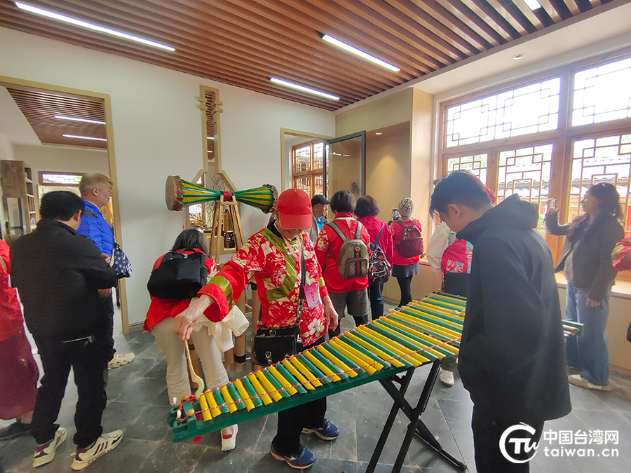 台胞在体验民族特色乐器。(河池市台办供图)