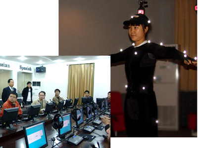 记者体验同声传译(左下)参观动态捕捉实验室(右上)