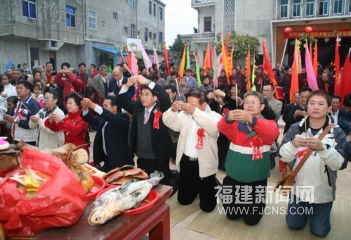 12月6日下午5时35分,参访团在村戏台前祭拜“玉二妈”神像。(图片来源:福建新闻网 谢汉杰 摄)