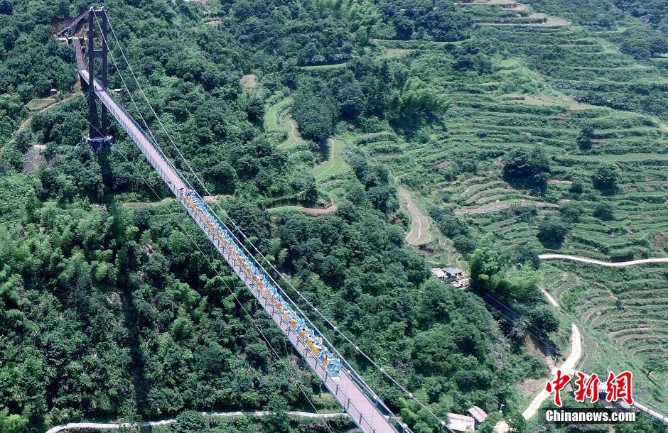 6月5日,一群来自江西省德兴市的太极拳爱好者,在婺源县篁岭景区距地面最深达110米的“天桥”上,上演空中舞太极。当天,在素有古村晒秋醉游人的江西省婺源县篁岭景区,首次观赏到演空中舞太极表演,近百名来自江西省德兴市的太极权爱好者,站在长298米、宽2.2米、距地面高达110米的高空天桥上,演绎了一场空中舞太极,展示出天人合一的壮观场景,吸引了众多游客前来观赏。据了解,这是篁岭景区针对每年的端午前后是人们养生健身的最佳时节,首次举办这项活动,旨在鼓励人们走进大自然,锻炼更健康。中新社发 卓忠伟 摄 图片来源:CNSPHOTO