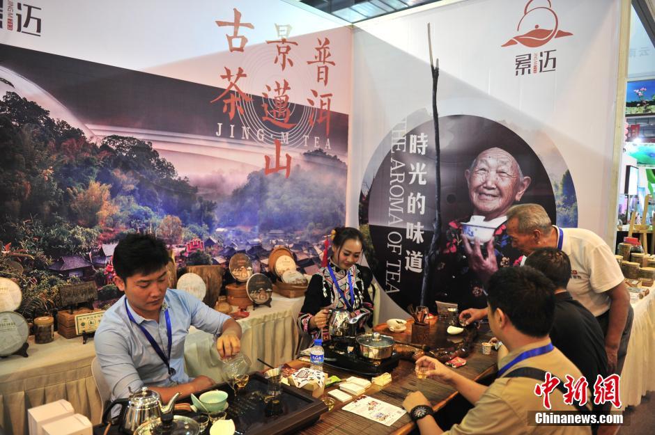 6月14日,来自普洱景迈山的茶企在展区,景迈山古茶园位于云南普洱市澜沧县,古茶园总面积2.8万亩,均为上千年的茶树。当日,在云南昆明举行的第四届中国-南亚博览会云南高原特色农业馆,展出的众多云南农特产品受到众多国内外客商的关注。云南地理优势独特、气候优势突出、物种优势明显,云茶、云菜、云菌、云花、云油、云南咖啡等一系列“云”字 号高原生态绿色农产品,成为“金字招牌”。其中核桃、天然橡胶、鲜切花、咖啡 面积和产量均居全国第一。云菜、云花远销香港、日本、东盟等国家和地区。中新社记者 刘冉阳 摄