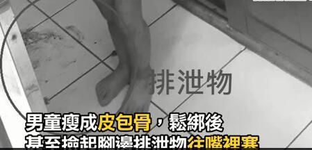 警方指出,此次遭虐的是二人年仅3岁的么儿,该男童有轻微行为障碍、学习迟缓。当天生母前往家中探视,没想到却见儿子全裸在阳台罚站,双手还绑着束带、绳子,且全身不但有大小瘀青,还瘦成皮包骨,两边的肋骨清晰可见,一被放下后竟急着捡地上排泄物吃,妈妈当场失声痛哭。