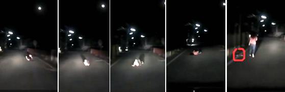 没想到该女子竟不死心,先是向左翻了一圈,眼见原PO没反应,又向右滚了两圈,还一手将鞋子丢出,想营造车祸现场,但原PO依旧完全不为所动……后来女子实在演不下去了,加上场面太尴尬,只好起身小跑步逃离现场。过程中,女子一度想转身捡回鞋子,但见原PO还在,只好头也不回继续跑,最后消失在黑暗中。
