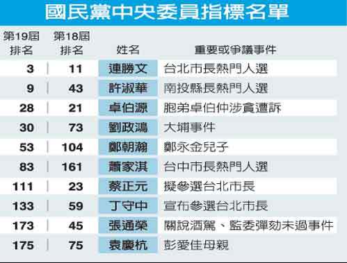 当选中委象征跻身党的权力核心,向来是国民党党内精英更上一层楼的表征。被外界视为角逐台北市长热门人选的连战儿子连胜文,就从上届的第11名攀升至第3名,显现在党内的政治实力不容小觑。