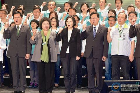9月19日,民进党“全代会”在桃园平镇举行,去年全代会留下的“冻独”议题,一如外界预料被“冷处理”,民进党将重点放在“总统”与“立委”选举造势上。民进党“总统”参选人蔡英文在发言时,只字未提及两岸关系。(图片来源:台湾东森新闻云)