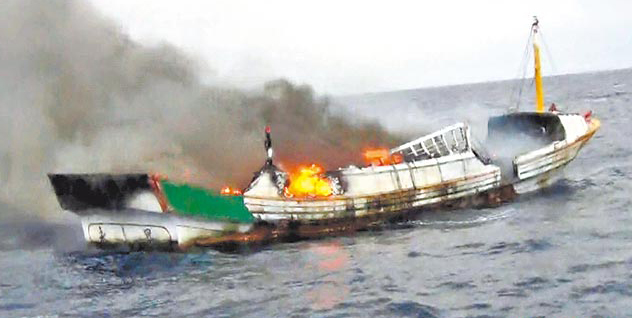 “永升106号”昨日凌晨在离海岸约52海里处,轮机室赫然冒出浓烟与火苗,因柴油储藏在轮机室,火势猛烈,船只烧毁、倾斜,全体船员跳海逃生。