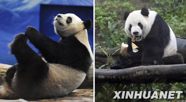 这是一张拼版照片:左图为“圆圆”吃饱睡好后为自己抓痒(2010年1月24日摄),右图为活泼可爱的“团团”正在吃新鲜竹笋(2010年1月24日摄)。新华社发(吴景腾 摄)