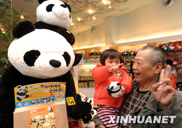 1月24日,一名参观者给小孙女买大熊猫造型的玩具。
