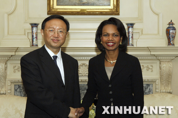 2007年11月26日,中国外交部长杨洁篪在美国首都华盛顿会见了美国国务卿赖斯。