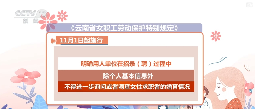 《云南省女职工劳动保护特别规定》11月1日起施行。明确用人单位在招录(聘)过程中,除个人基本信息外,不得进一步询问或者调查女性求职者的婚育情况。