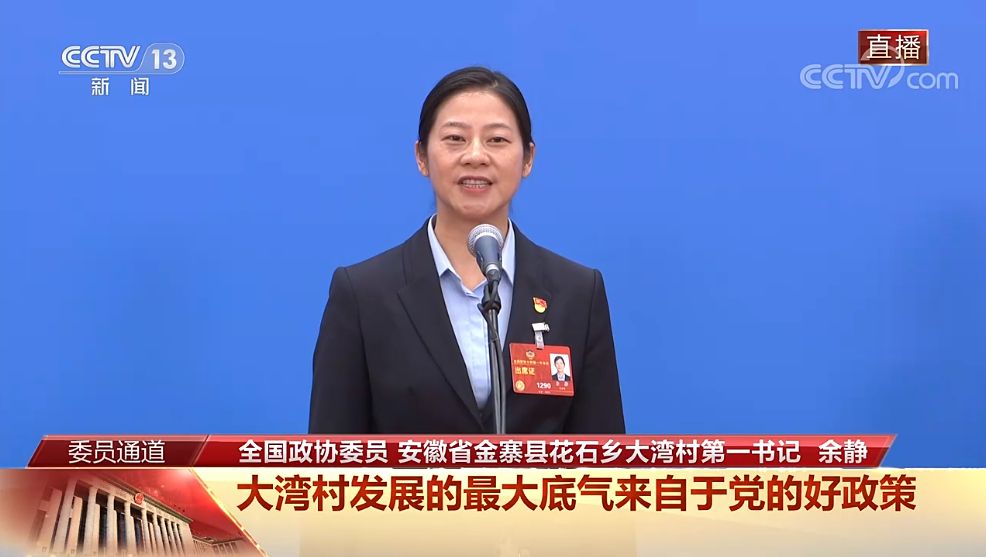 在全国政协十四届一次会议第三场“委员通道”上,全国政协委员、安徽省金寨县大湾村党总支第一书记余静谈起在大湾村工作的8年,体会最深的是农村发展最大的底气,来自于党的好政策。 图自央视直播截图