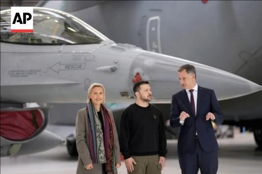 今年5月,比利时首相(右)和防长(左)与乌总统泽连斯基在F-16战机前合影。图/美联社网站截图
