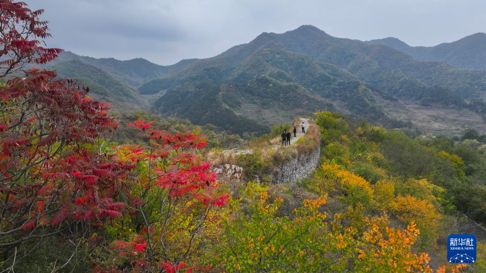 10月18日,游客在河北省迁西县上营镇青山关长城景区游玩(无人机照片)。