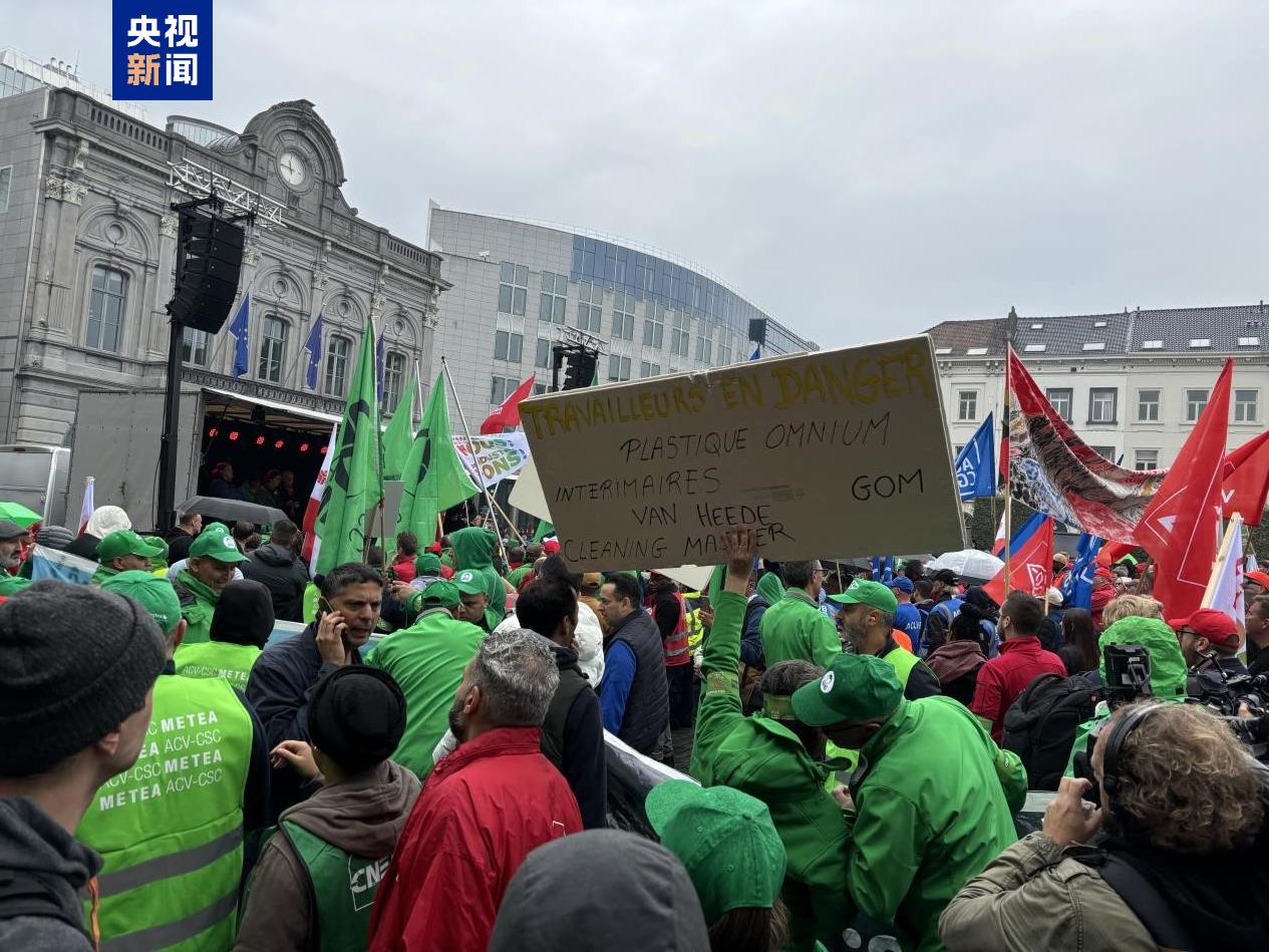 △9月16日,比利时一家奥迪工厂工人在布鲁塞尔市中心的卢森堡广场举行示威活动(总台记者顾鑫拍摄)