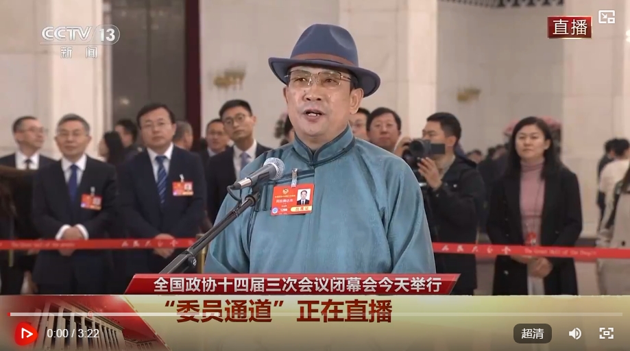 今天(3月10日),全国政协十四届三次会议第三场“委员通道”在人民大会堂举行,全国政协委员、内蒙古苏尼特左旗乌兰牧骑队长阿拉腾达来接受了记者采访。