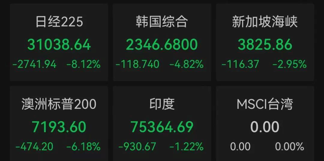 亚洲其他股市周一也出现大跌,日经225指数期货、东证指数期货在触及跌停板后暂停交易。