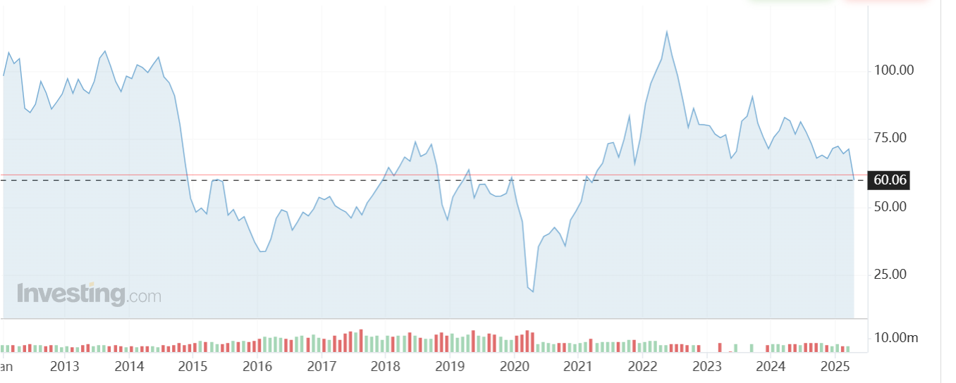 原油市场同样未能幸免,尽管上周累计下跌10%,周一WTI原油期货继续重挫,跌破60美元/桶,为自2021年4月以来新低,日内跌幅达4%。