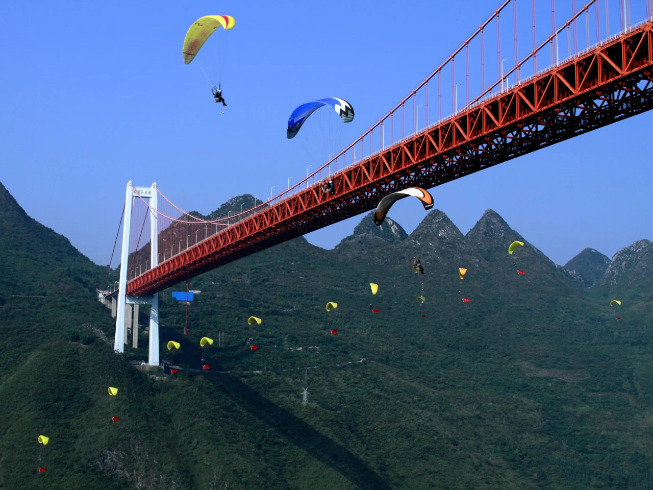 贵州被称为“世界桥梁博物馆”。位于安顺的坝陵河大桥是世界首座跨越山区峡谷的千米级桥梁。在这座高桥上,游客可以完成高空蹦极、高空秋千、极速滑降等极限运动。