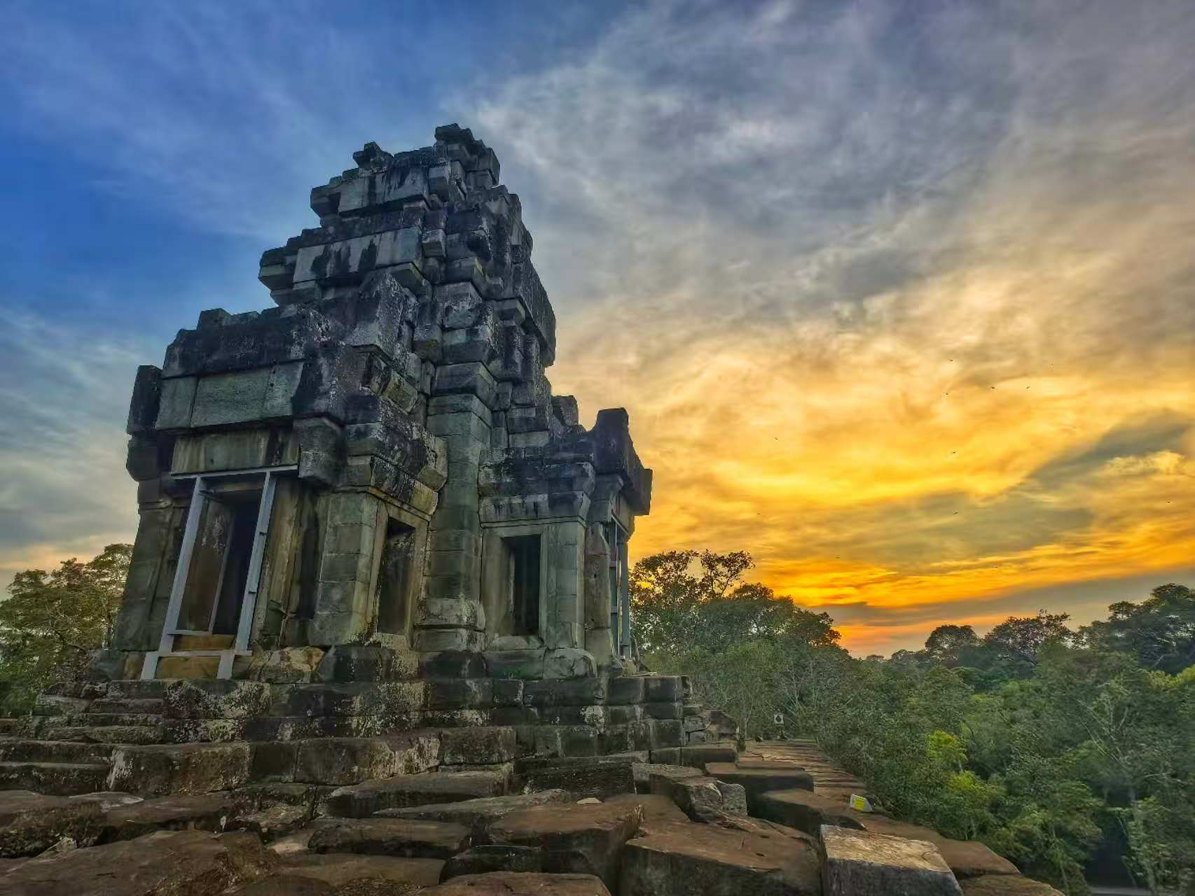 位于柬埔寨暹粒省的吴哥古迹坐落在一片密林之中。傍晚,一缕夕阳照射在茶胶寺高耸的砂岩塔上,为这座千年古寺笼罩上了一层柔和的金光。“Hello Bong(你好,大哥)!”记者向管理员打招呼。“你好!”管理员用中文回复道。