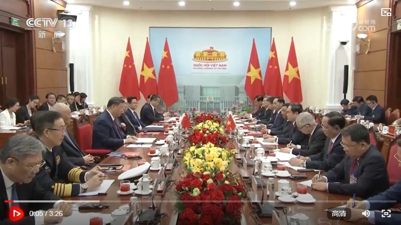 习近平指出,再次对越南进行国事访问,亲眼见证了越南革新事业取得的新成就,亲身感受到中越友好的深厚根基。当前,中国正在以中国式现代化全面推进强国建设、民族复兴伟业,越南即将开启民族发展新纪元,双方都处在各自发展振兴的关键时期。面对变乱交织的国际形势,中越两国要坚定道路自信和制度自信,加强团结协作,持续深化具有战略意义的中越命运共同体建设,携手迈向现代化,为世界注入更多稳定性和正能量。
