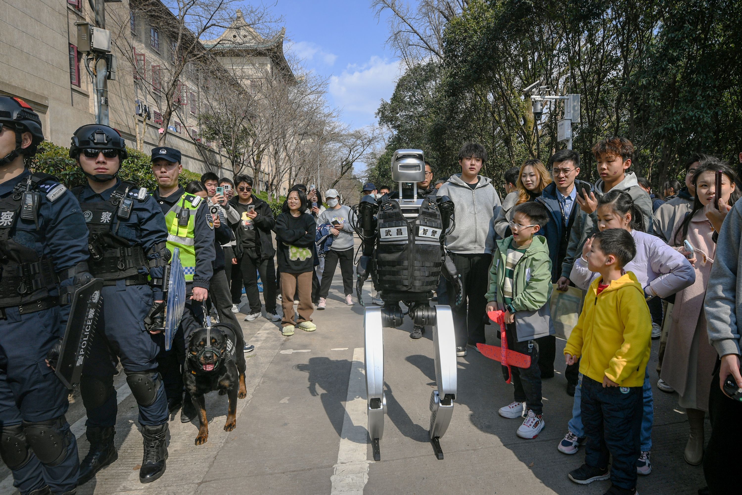 3月16日,武汉大学樱花大道上,一台身着黑色马甲的人形机器人“智警小珞”穿梭在赏樱人群中。