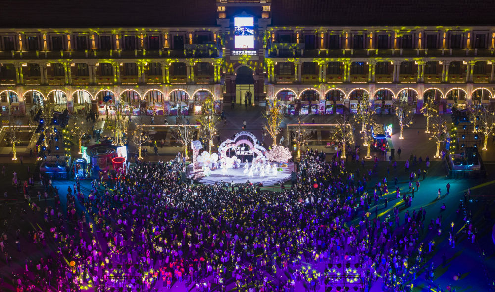 这是4月3日拍摄的第三届五大道海棠花节启幕现场(无人机照片)。明媚春日带动人们赏花踏青出游热情,“春日经济”热力十足。(新华社记者赵子硕 摄)