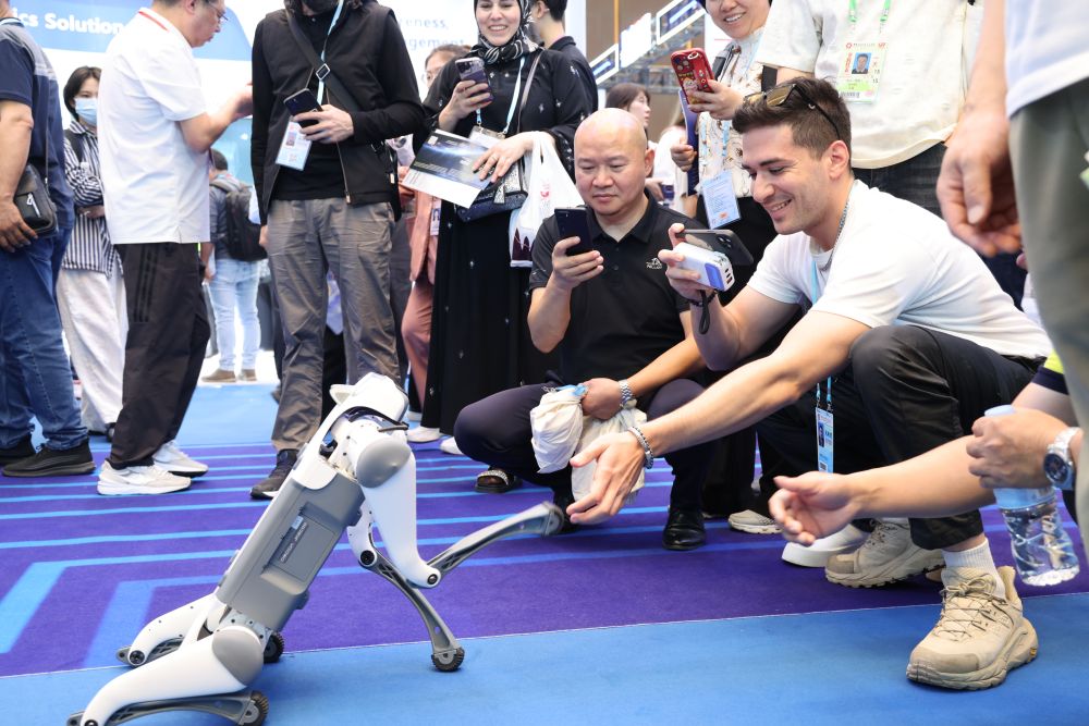4月15日,在第137届广交会服务机器人专区,客商跟机器人互动。4月15日,有“中国第一展”之称的广交会迎来第137届。15日至19日举行的广交会第一期以“先进制造”为主题,首次增设服务机器人专区。第一期突出先进产业和科技支撑,参展企业达11304家,其中“新三样”、数字技术、智能制造相关题材参展企业约3700家。新华社记者卢汉欣 摄