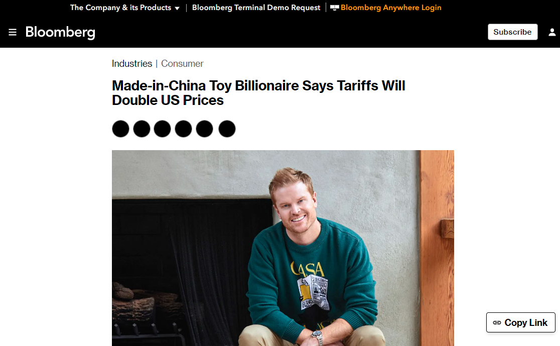 “以目前的关税水平来看,至少玩具的零售价格会翻倍。”莫布雷说,“我们和大多数竞争对手的处境一样,因为80%的玩具都是在中国制造的。美国政府可能会从全美各地的家庭和孩子们手中‘偷走圣诞节’。”
