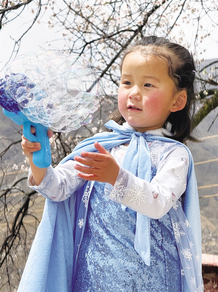 清明假期,小朋友在帕崩岗与桃花合影。记者 德吉曲珍 摄