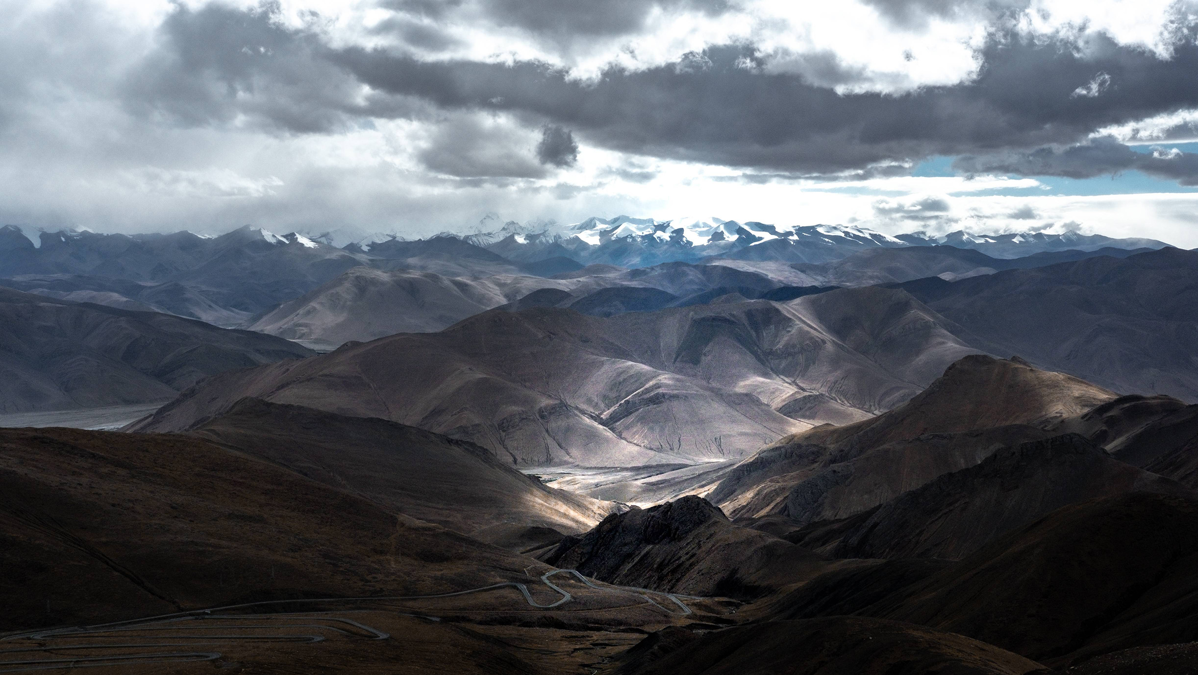 照片拍摄于去珠峰大本营路上的观景台,展现了连绵起伏的山脉和蜿蜒的公路。远处的雪山在云层中若隐若现,给人一种神秘而壮丽的感觉。整个画面色调偏暗,突出了高原的荒凉与雄浑,让人感受到大自然的磅礴气势和宁静之美。
