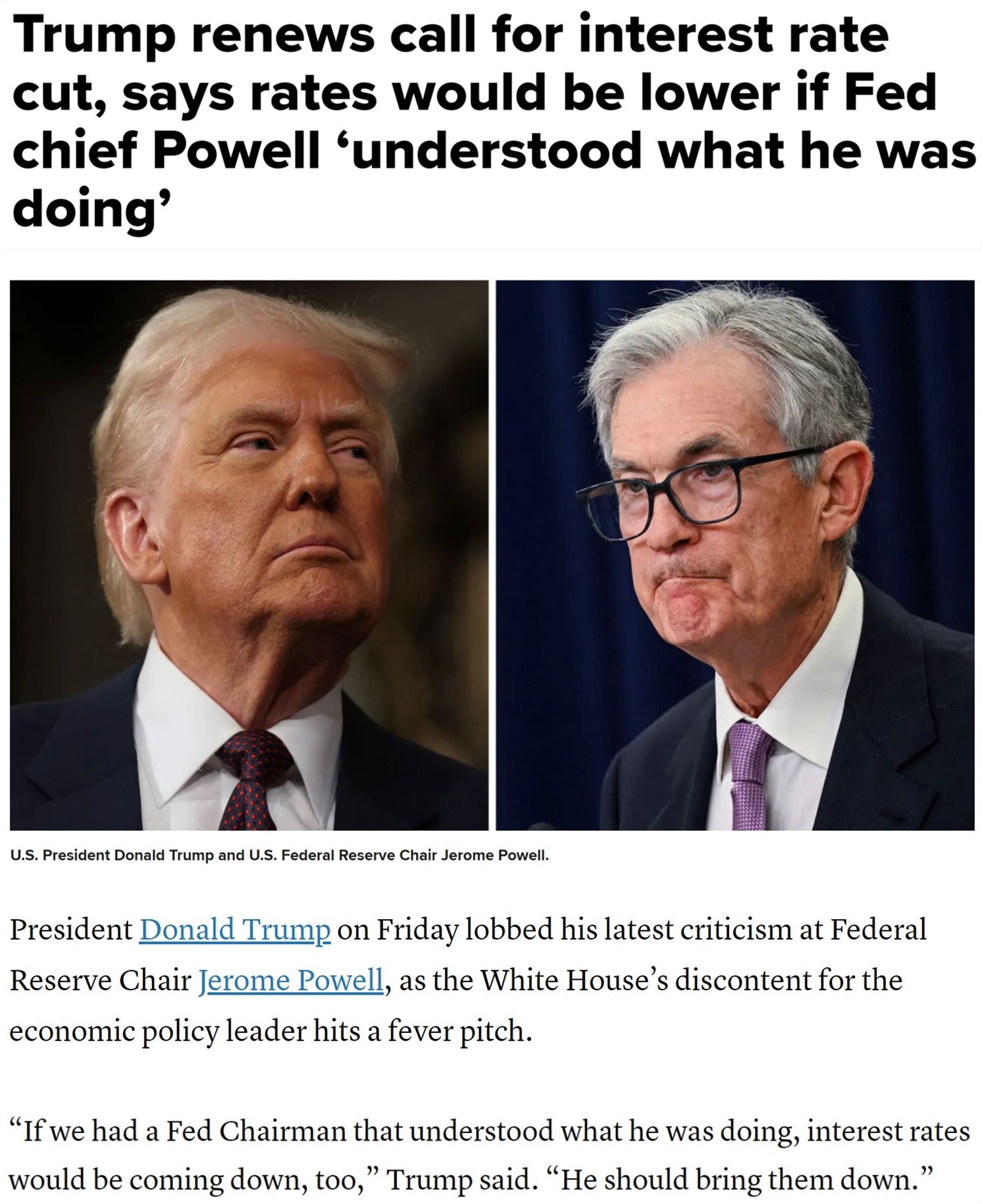 如今,开启第二个总统任期,特朗普继续对鲍威尔开启“催催催”模式。