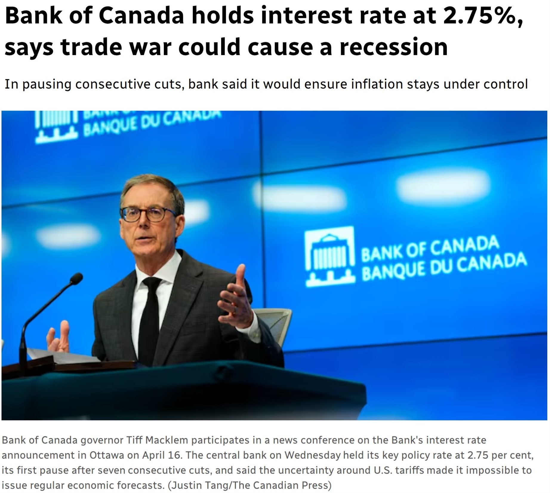 加拿大银行上个月刚刚宣布将基准利率下调25个基点至2.75%,并表示尽管加拿大经济今年开局强劲,但贸易紧张局势加剧和美国关税政策可能减缓加拿大经济活动步伐,并增加通胀压力。