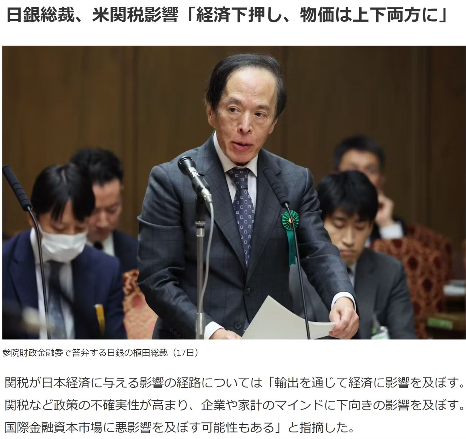 日本央行行长植田和男说:“一方面,美国关税政策将直接影响贸易活动,例如影响日本的出口,进而影响日本经济,此外美国的关税等政策会导致不确定性显著增加,对企业和家庭的信心造成冲击,还可能对国际金融资本市场产生负面影响。照此下去,美国的关税政策预计将成为导致日本经济下行的主要原因。”
