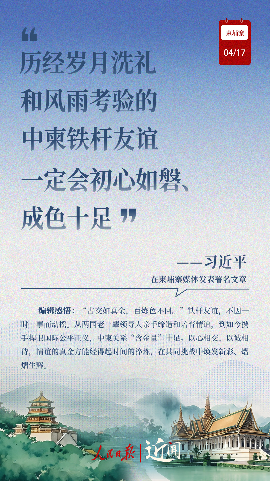 “古交如真金,百炼色不回。”从两国老一辈领导人亲手缔造和培育两国友好,到率先构建双边命运共同体,再到构建新时代全天候中柬命运共同体,中柬关系新定位水到渠成。