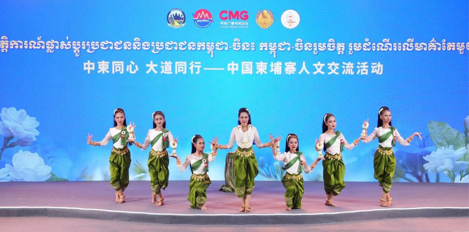 △2025年4月17日,“中柬同心 大道同行——中国柬埔寨人文交流活动”现场,来自柬埔寨帕花黛维公主舞蹈学校的师生代表在中国民歌《茉莉花》的旋律中表演柬埔寨传统舞蹈。
