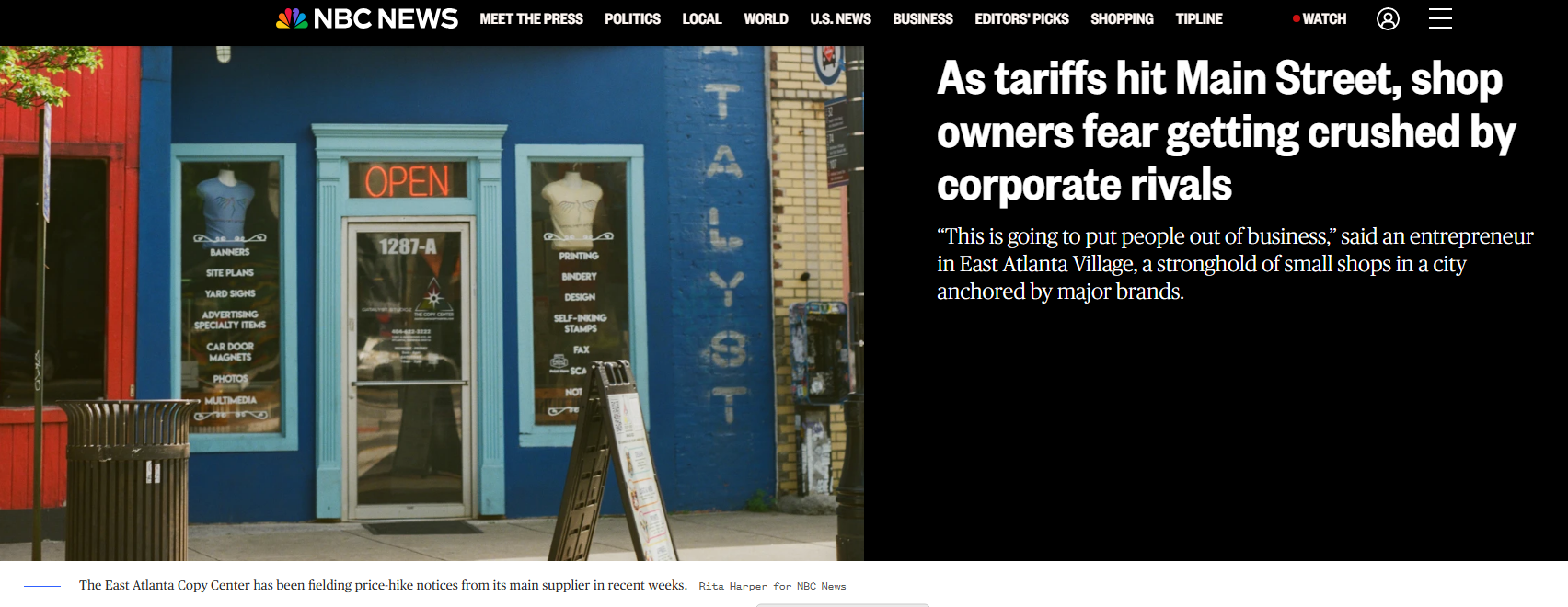 美国全国广播公司网站的一篇报道说,随着关税冲击美国商业,美国小企业主都在担心自己的企业被压垮。