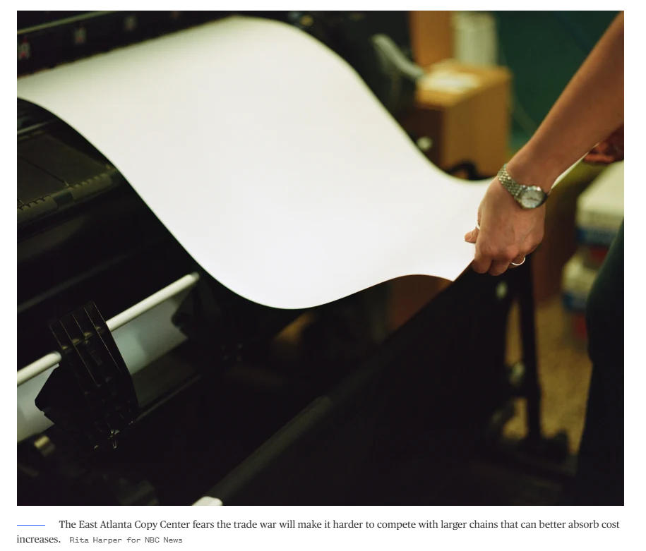 报道以一家在东亚特兰大村的印刷店为例说,企业主米基·西尔维斯特罗斯表示,近期,她的主要供应商不断通知她,从复印纸到螺旋装订线圈、覆膜卷等所有材料的价格都在上涨,这迫使她将经营重点从扩大业务转移到重新调整采购上。